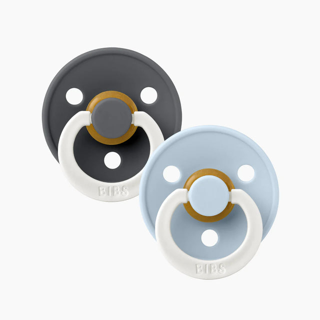BIBS Pacifier 2 Pack - Night Glow - Iron/Baby Blue - Size 1 is backordered and will ship as soon as it is back in stock.