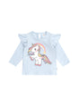 Super soft, premium organic cotton jersey long sleeve frill top with rainbow unicorn print