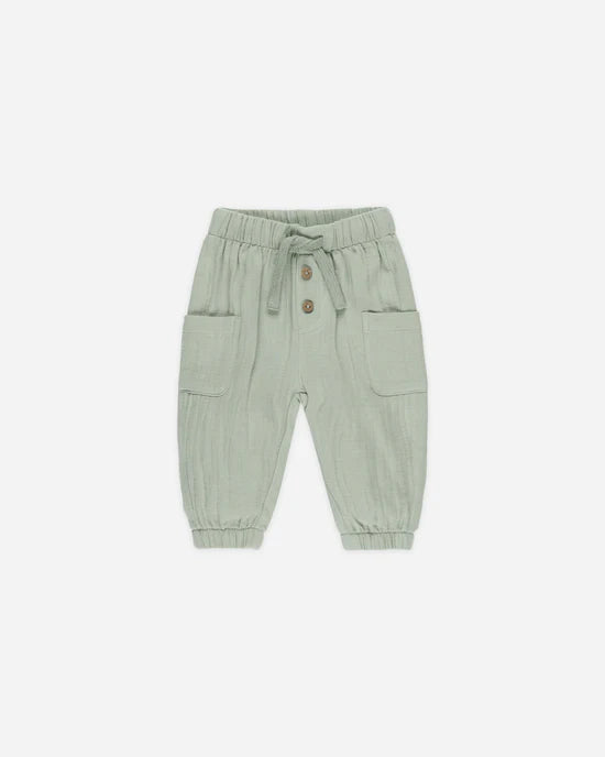Comfortable woven pants featuring an elastic waistband and leg openings, adjustable drawstring, and side pockets.