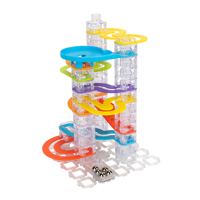 - Builder set includes 1 catcher, 1 topper, 55 risers, 5 stainless steel marbles, 10 unique tracks, base grid