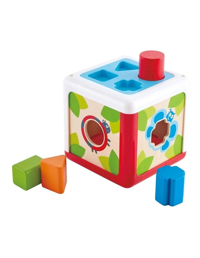 This colourful sorting box teaches children all about shapes and garden creatures. Place the pegs into the right-shaped holes. Encourage your child to feed the pegs through the correct holes. Open the elastic strings to remove the blocks. Ages 12mnths+