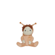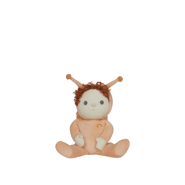 In a soft, velvety orange jumpsuit with matching hood and antennae, Scottie is the epitome of warmth and comfort. Rich, fiery orange curls and ashy hazel eyes are a soft contrast to the big, swirling snail shell on his back, which boasts a delightful yellow embroidery. With a gentle presence and laid-back style, Scottie is the perfect companion for little ones who love to slow down, snuggle, and enjoy the quiet moments.