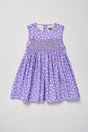 Bright lilac fun sundress with no sleeve or collar. Crisp white hand smocking with pops of tangerine white and lilac flowers. Belt back with pale lilac buttons.