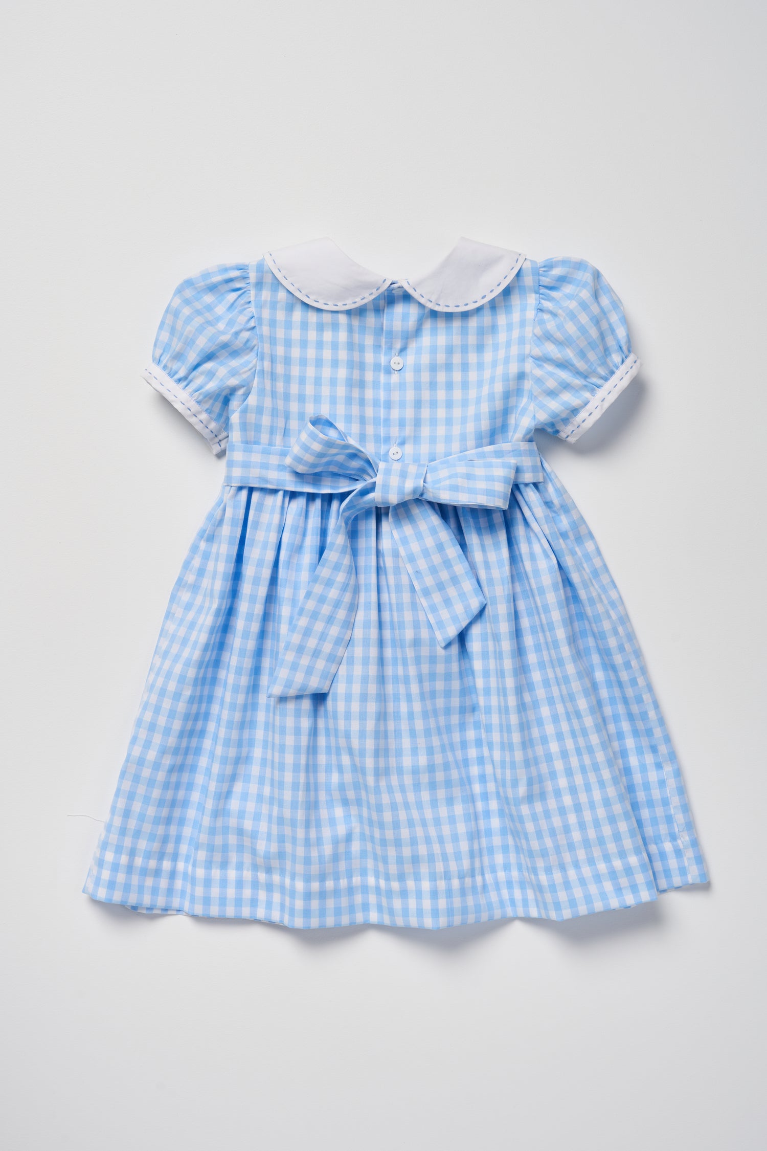 Smox Rox classic, white Peter Pan collar with hand stitched blue edging. Exquisite blue and white hand smocking on bodice. Hand stitched edge on puff sleeve. Pure white buttons at back with blue and white sash tie.