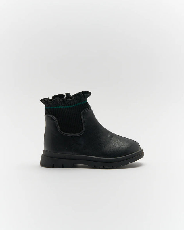 The Flora Boot is a stylish and versatile choice for your little one's wardrobe. Crafted in sleek black faux leather, these boots feature a playful ruffle trim at the ankle for a fun and trendy touch. With an easy side zipper for quick on and off, these boots are perfect for both casual and dressed-up occasions. The cushioned sole provides all-day comfort, while the durable design ensures they'll withstand plenty of adventures.