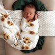 Our Snuggle Hunny organic cotton jersey wrap with matching topknot is soft, snuggly and stretches with baby. This wrap features our exclusive Snuggle Hunny Sunflower design and is made with GOTS Certified Organic Cotton CU 1182228.