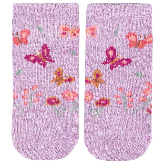 The Organic Socks Ankle Jacquard Lavendula features an artisan jacquard knit pattern, with a spring butterfly theme.